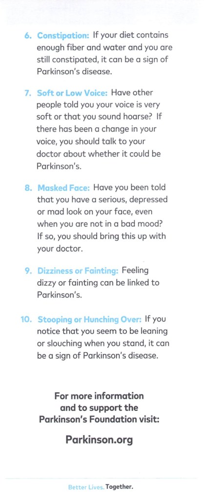 One pitch caught my eye – an ask from the Parkinson’s Foundation. On the front of the envelope it said “10 Early Signs of Parkinson’s Disease.”